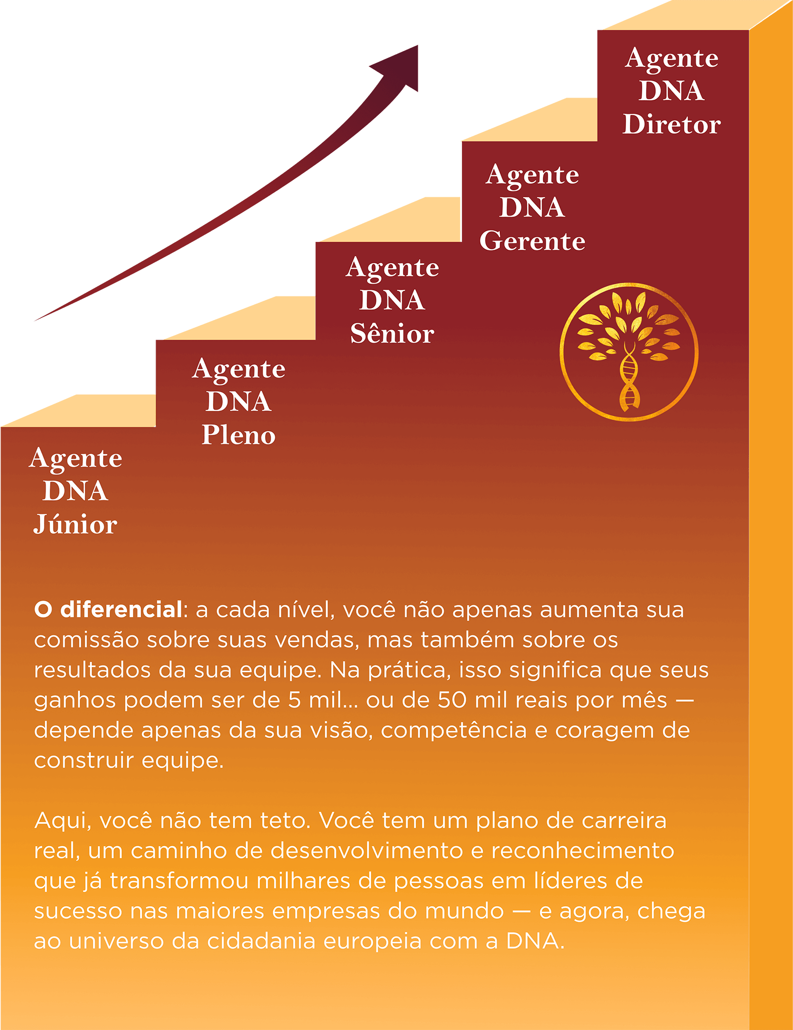 E à medida que cresce, passa a formar, inspirar e liderar novos Agentes DNA — construindo resultados que se multiplicam.