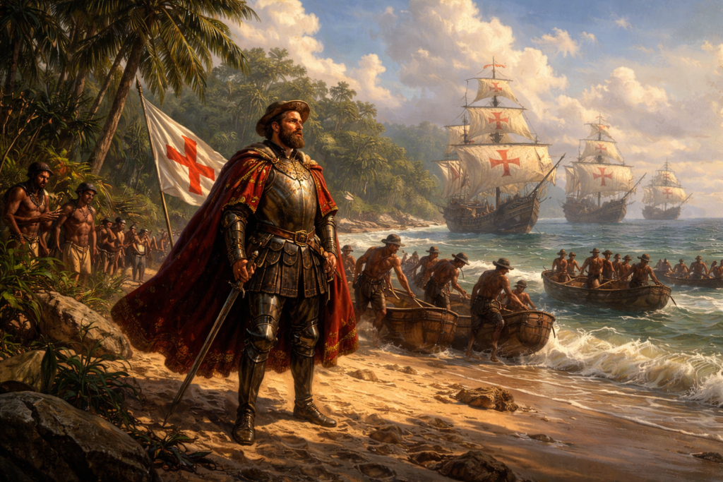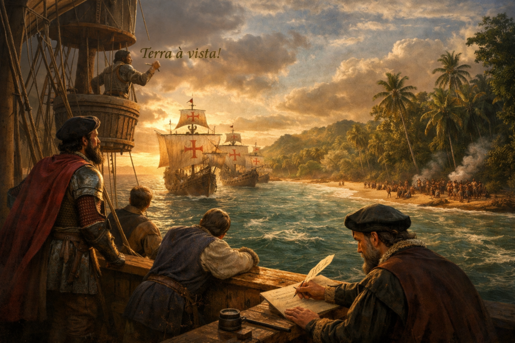 Naquela manhã, quando finalmente se avistou terra, não houve imediatamente a consciência de que se tratava de um novo capítulo da história humana. Primeiro veio apenas a surpresa. Uma linha verde no horizonte. Depois colinas. Depois uma imensa faixa de floresta que parecia não ter fim.