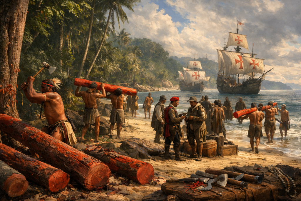 A exploração dessa madeira deu origem a uma das primeiras atividades econômicas desenvolvidas no território. Esse comércio envolveu relações entre portugueses e grupos indígenas, que participavam do processo de extração em troca de ferramentas, utensílios e outros produtos trazidos pelos europeus. Esse sistema de trocas, conhecido posteriormente como escambo, representa um dos primeiros exemplos de interação econômica entre as duas sociedades.