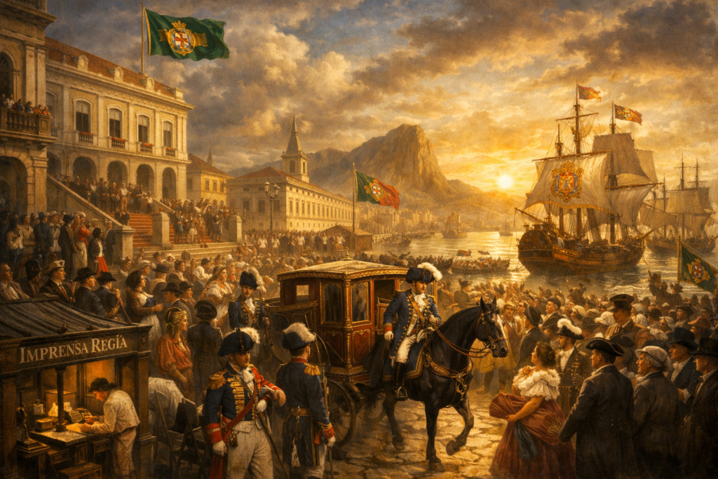 Quando as tropas francesas ameaçaram invadir Portugal em 1807, a monarquia portuguesa tomou uma decisão extraordinária: transferir toda a corte para o Brasil.