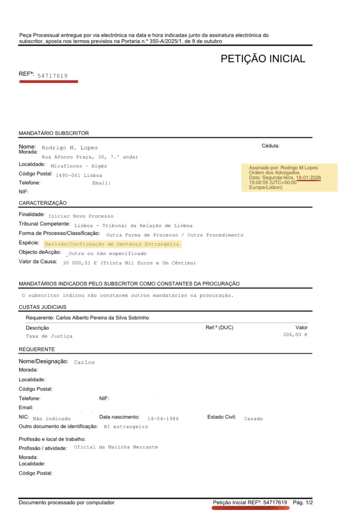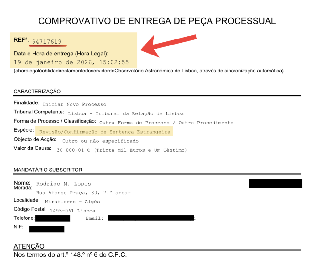 No caso concreto analisado, a ação especial de revisão e confirmação de sentença estrangeira foi proposta no Tribunal da Relação de Lisboa em 19 de janeiro de 2026, conforme comprovativo oficial de submissão eletrónica via CITIUS, e teve decisão favorável proferida em 26 de janeiro de 2026, ou seja, em apenas 7 dias corridos.