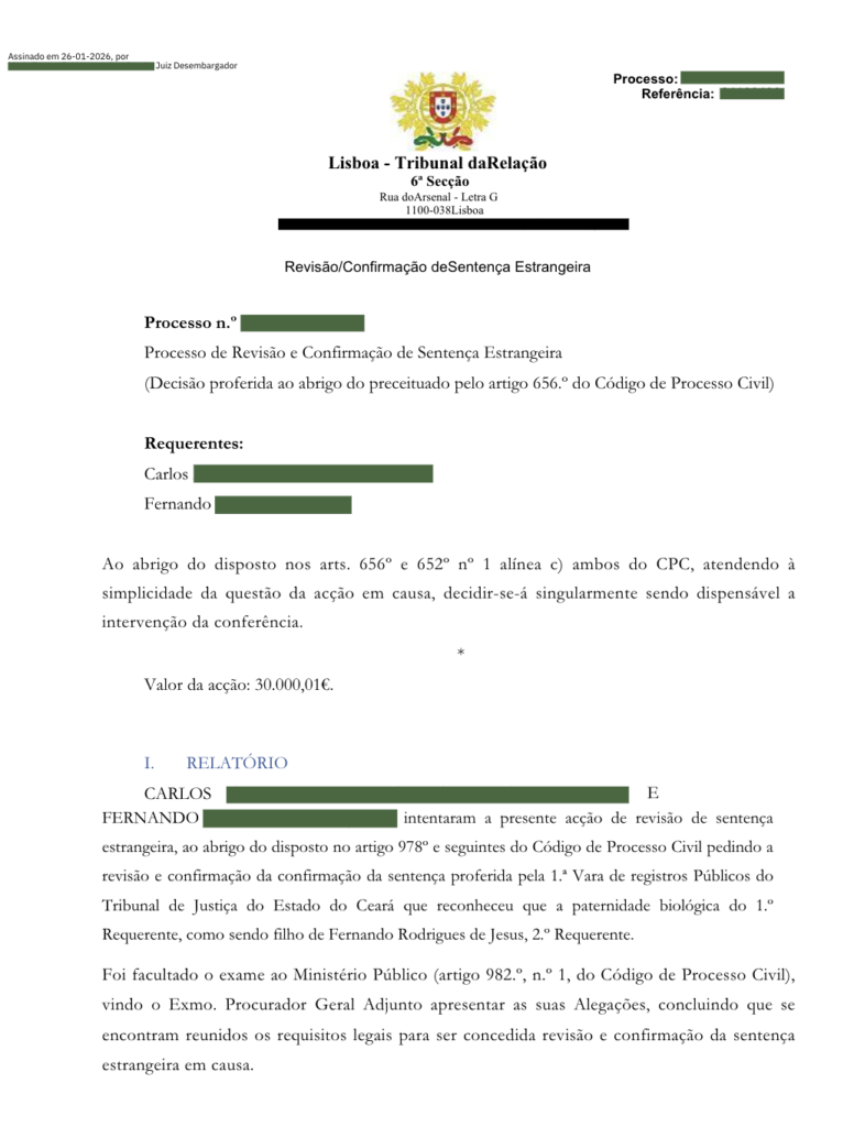 E eu vou te mostrar isso com base numa decisão recente do Tribunal da Relação de Lisboa (TRL), proferida em 26 de janeiro de 2026, em que o Tribunal decidiu singularmente por simplicidade da causa (arts. 656.º e 652.º, n.º 1, al. c), CPC) e confirmou a decisão estrangeira — exatamente no espírito do que ocorre quando não há oposição e os requisitos formais estão “redondos”.